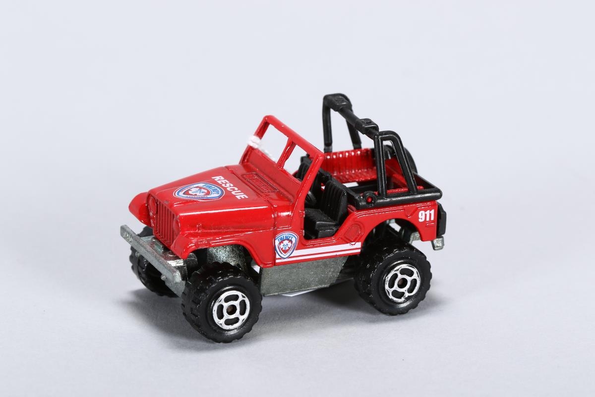Rauður Jeep CJ merktur björgunarsveit amerísks slökkviliðs. Bíllinn er í hlutfalli 1:54 með tankvagn (BYR2017-908-1)