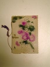 blómamunstri og blúndumunstur er á hliðum þess. Hér er áletrunin"Til