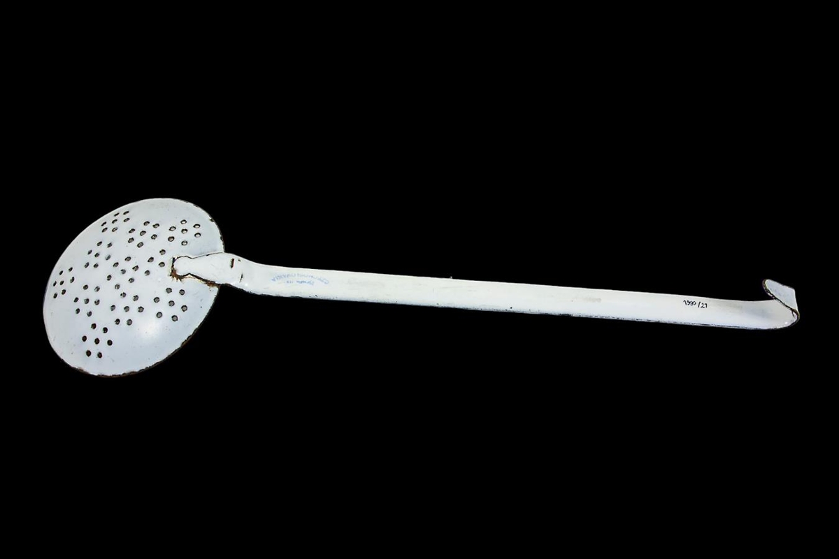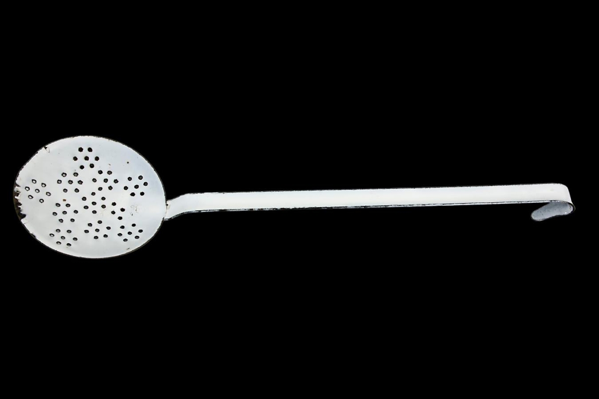 Fiskspaði úr járni, hvítemanlerað.