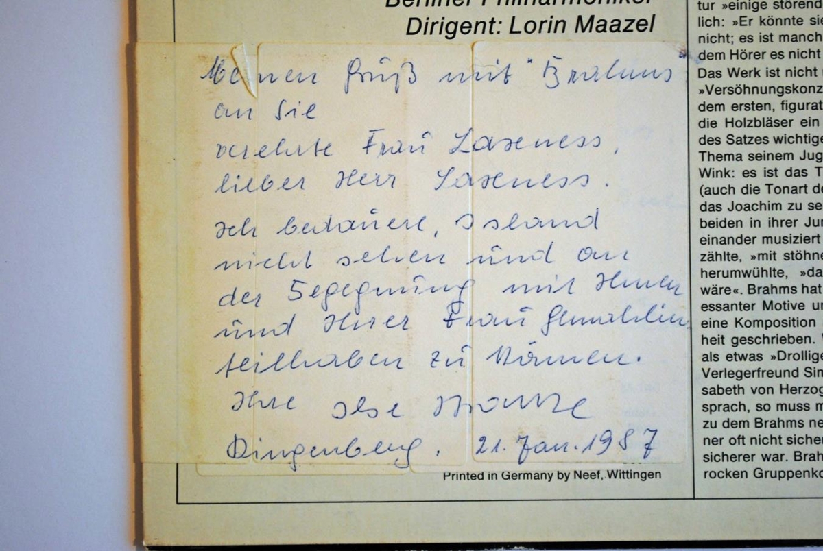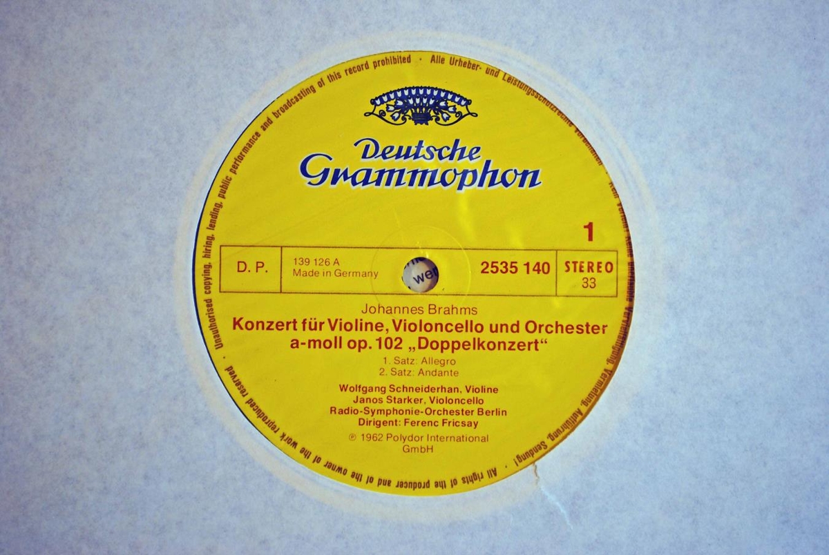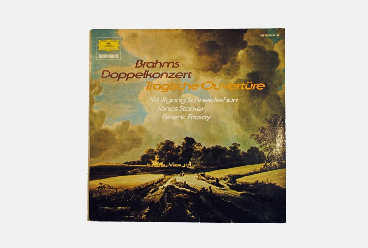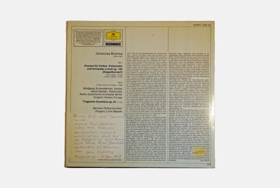 Tvö verk eftir Brahms, Konzert für Violine, Violoncello und Orchester a-moll op. 102 (Doppelkonzert) og Tragische Ouvertüre op.81. Aftan á plötunni er áritun og kveðja á þýsku sem ekki hefur tekist að lesa úr.