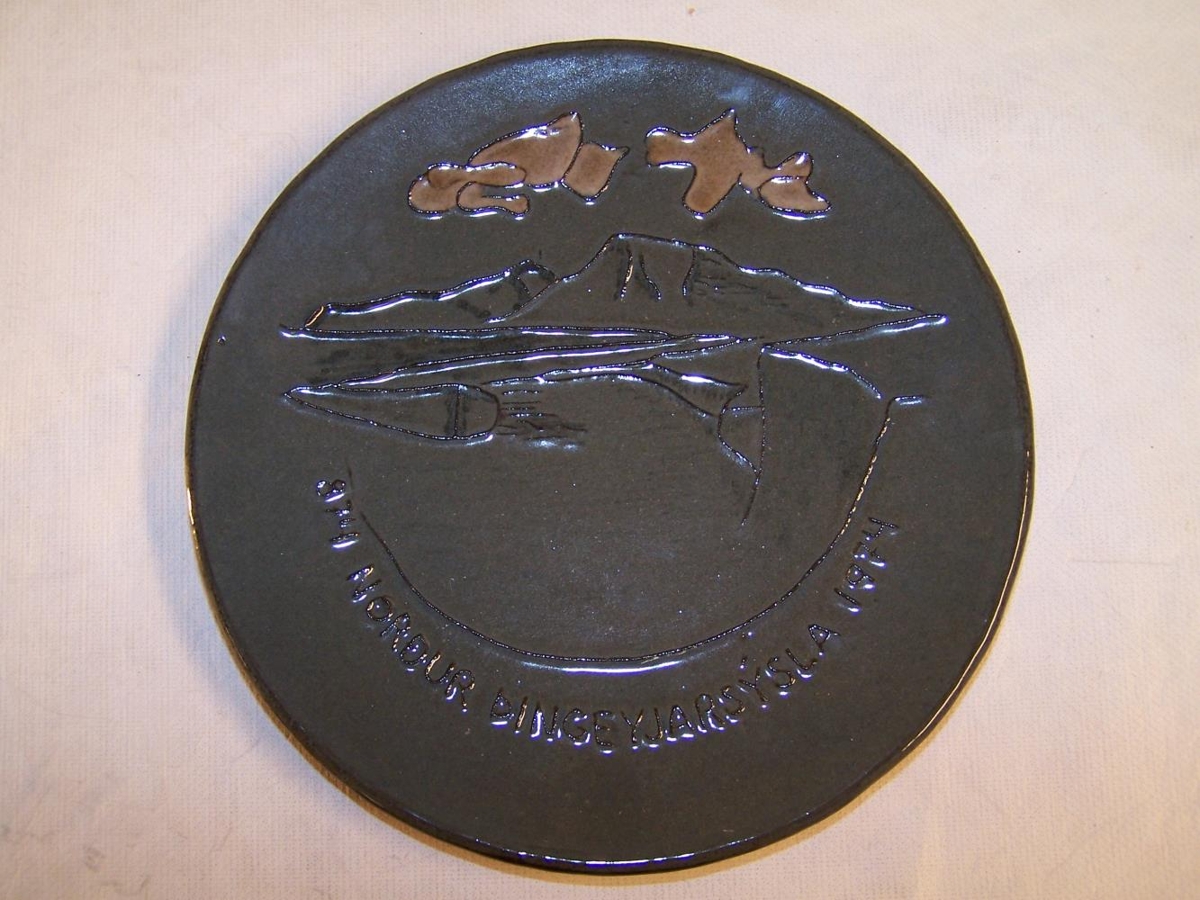 Grár veggplatti. Mynd af landslagi og skýjum. Svarthvít mynd. Undir mynd stendur: 874 Norður Þingeyjarsýsla 1974. Aftan á disk stendur: GLIT Iceland Lava. Einn af þremur eins plöttum sem bárust, á þessum eru skýin áberandi brún miðað við hina.