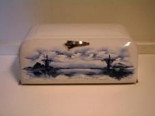 hald úr málmi. Framan á lokinu er mynd af myllum og landslagi í bláum lit.