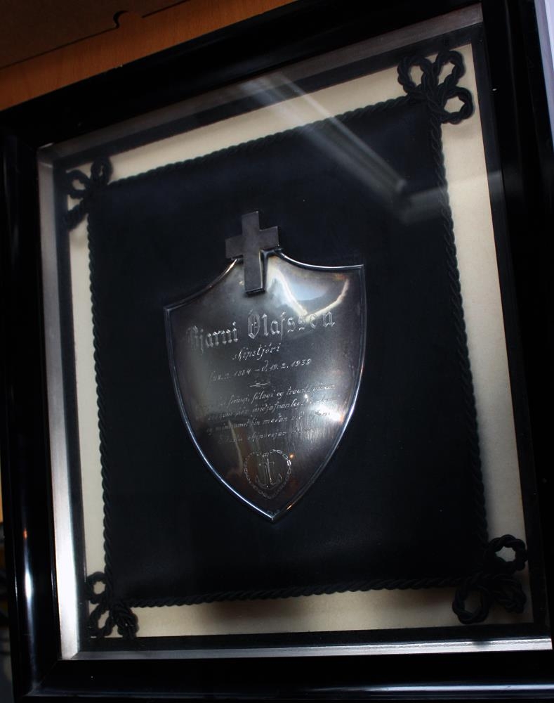 Minningaskjöldur úr silfri,hjartalaga með krossmarki efst.Skjöldurinn er festur á svartan silkipúða með kögri eða umgjörðúr svartri silkisnúru. Á skjöldinn er eftirfarandi grafið: