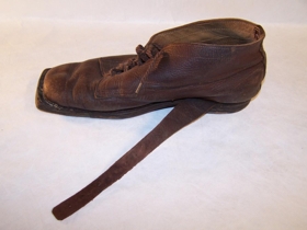 Gönguskíðaskór á hægri fót. Smíðaður af Helga Sigurgeirssyni söðlasmið Stafni í Reykjadal, fyrir Erlend Konráðsson þegar hann starfaði sem héraðslæknir með aðsetur á Kópaskeri (1949-1956). Erlendur þurfti stundum að ferðast á skíðum milli staða vegna vinnu sinnar.Skórinn var afhentur ásamt hinum skónum úr parinu. Erlendur flutti skóna með sér þegar hann fluttist til Akureyrar. Þaðan fóru þeir til Konráðs sonar hans í Reykjadal. Skórnir voru notaðir fram yfir 1980.
