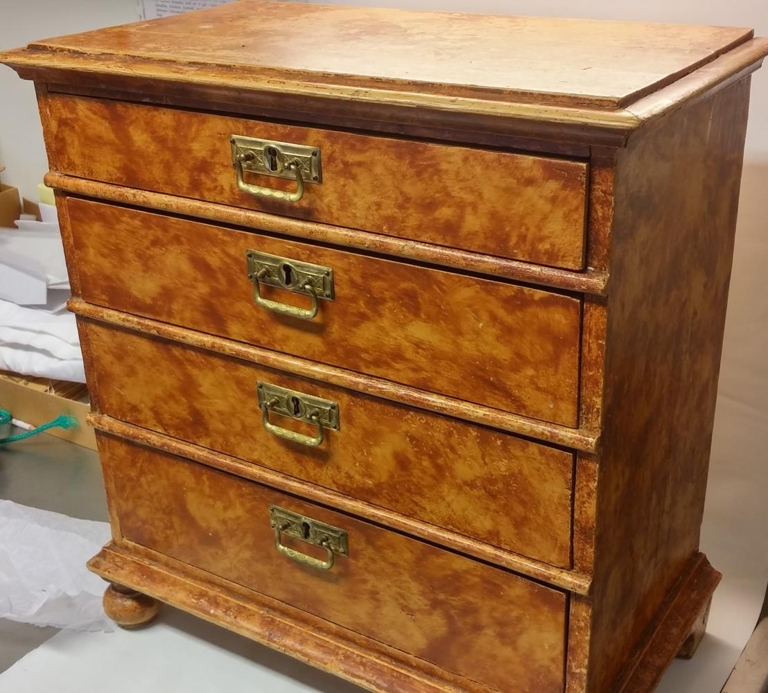 Lítil kommóða með fjórum skúffum, orðruð málning, ljósbrún að lit.