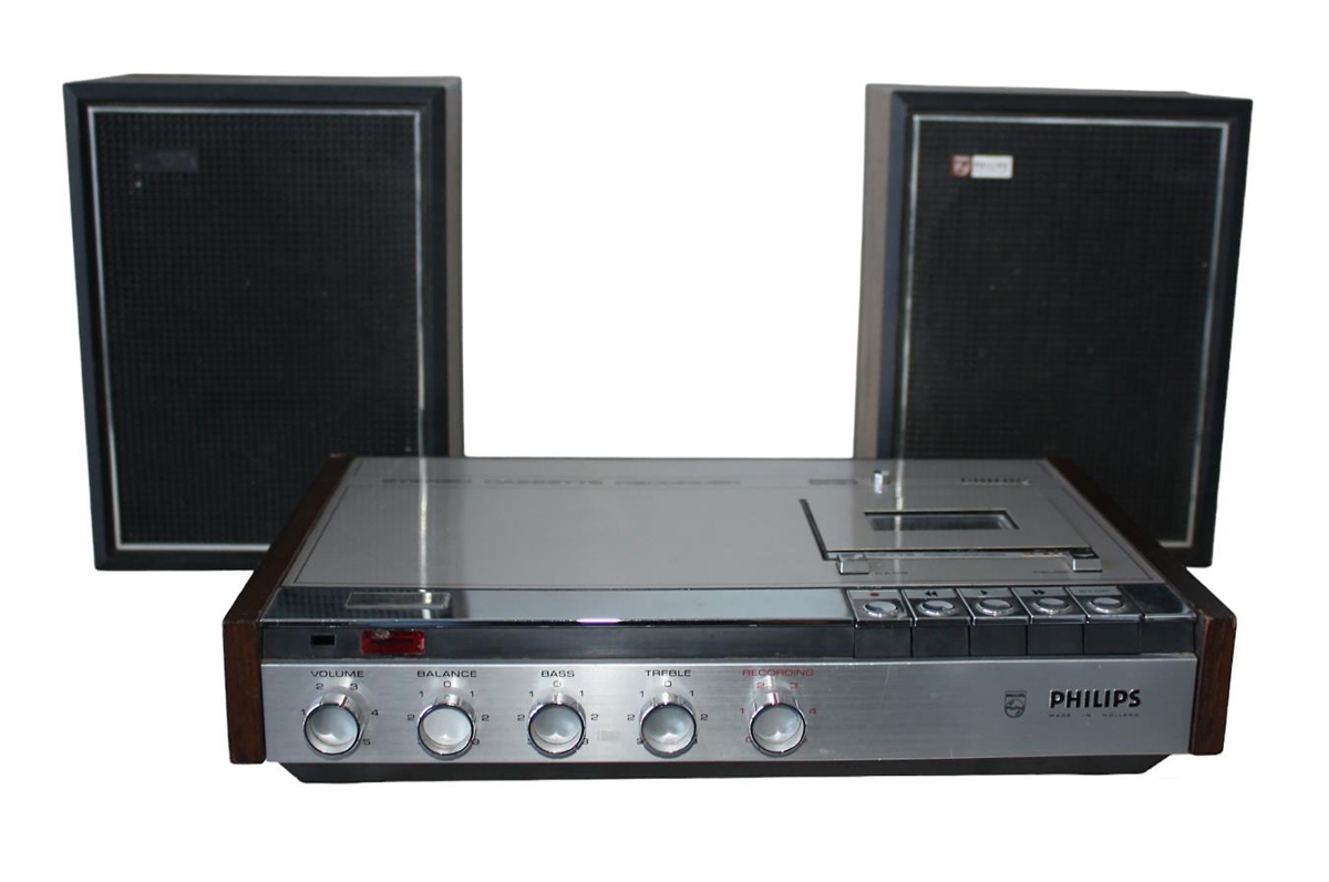Kassettutæki + 2 hátalarar ,teg.Philips 2400. Þessi tegund var framleidd á árunum 1971-1976. Gef. Bjarnfríður Leósdóttir.