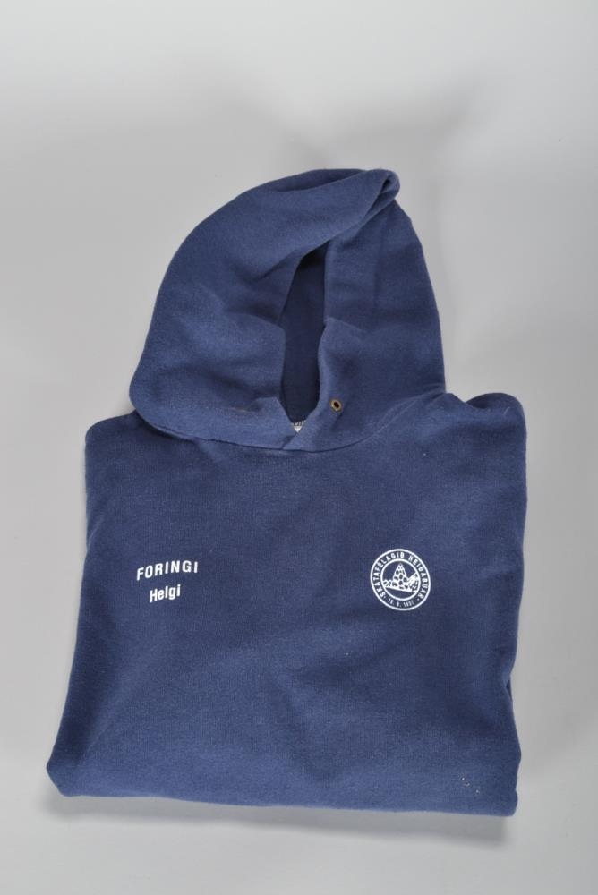 Dökkblá hettupeysa í stærðinni XL og merkt með merki skátafélagsins Heiðabúa á vinstra brjósti og Foringi á samt nafni á hægra brjósti