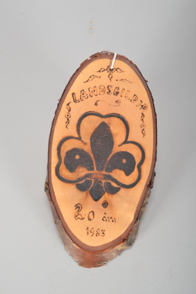 Tréplatti úr íslensku birki með innbrenndu merki St. Georgsgildisins og áletruninni „Landsgildið 20 ára 1985“