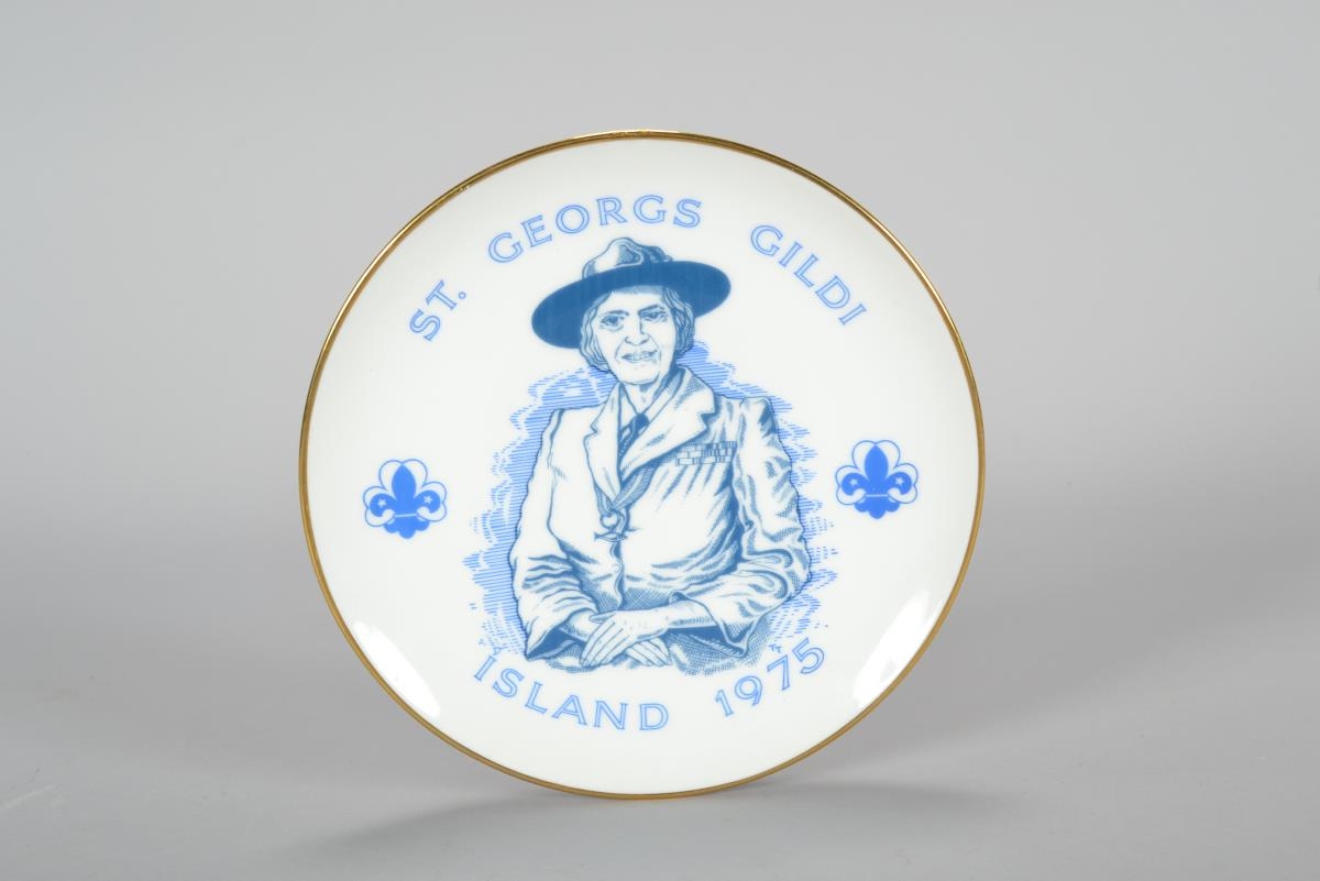 Hvítur veggplatti úr postulíni með gylingu á kantinum og mynd af Olave St Clair Baden-Powell barónessu, eiginkonu Banden Powell stofnanda skátahreyfingarinnar. Einnig er ritað á hann "St. Georgs gildi, Ísland 1975"
