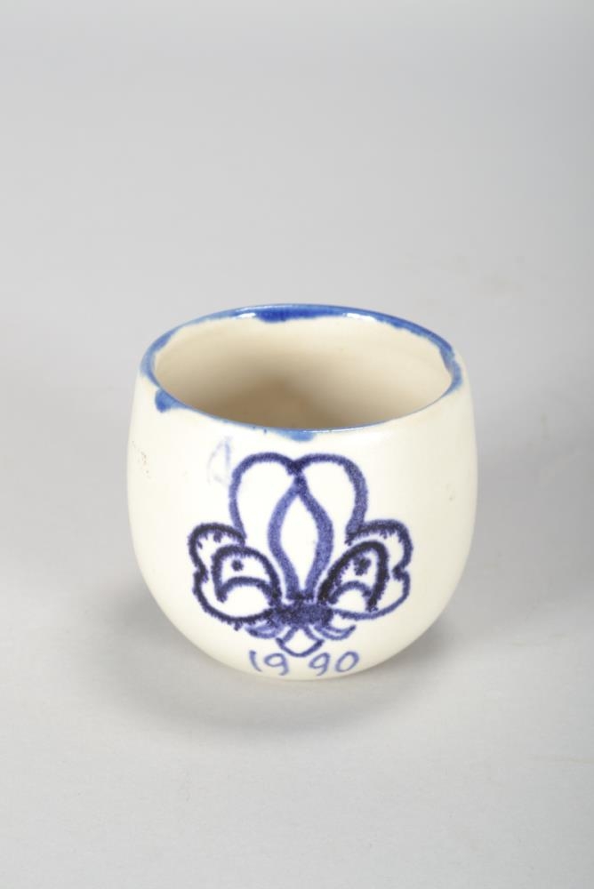 Hvítur bolli úr brenndum leir og með merki St. Georgs gildisins á íslandi og ártalið 1990.