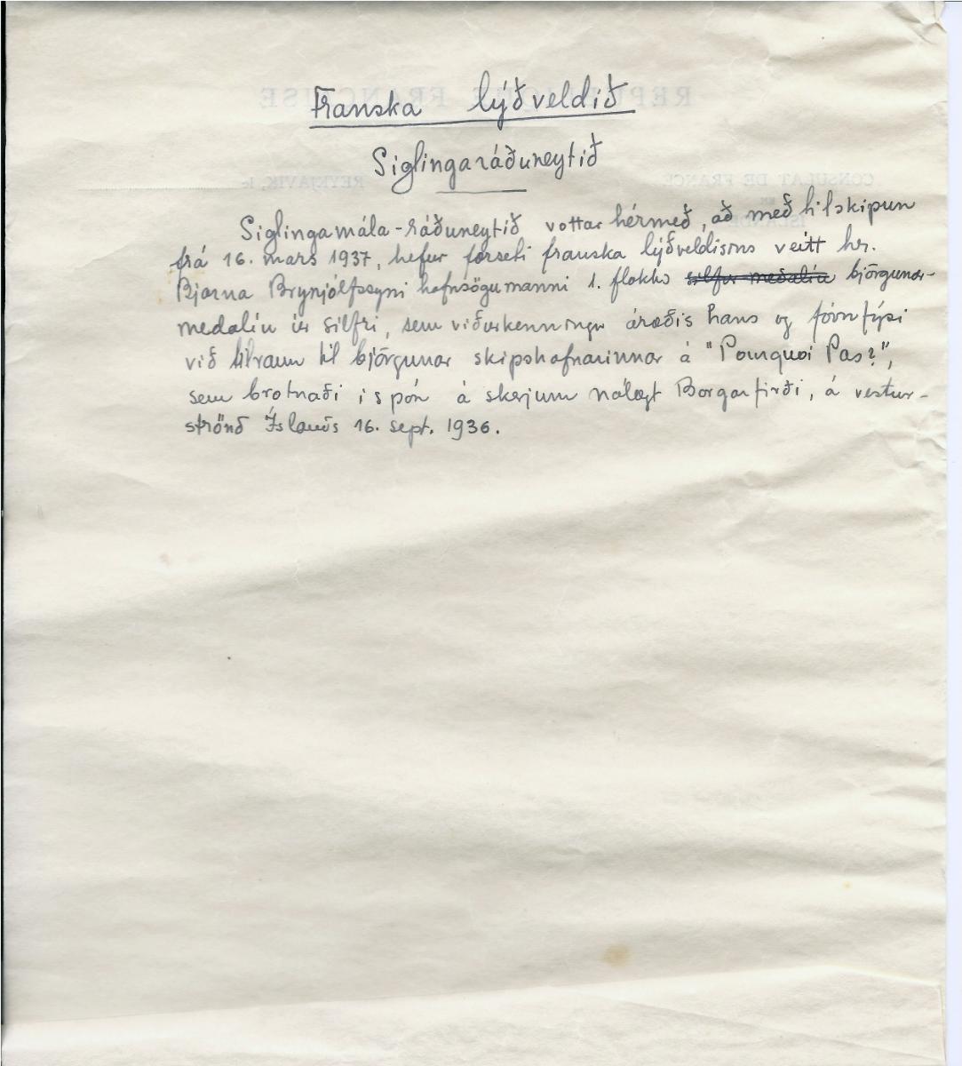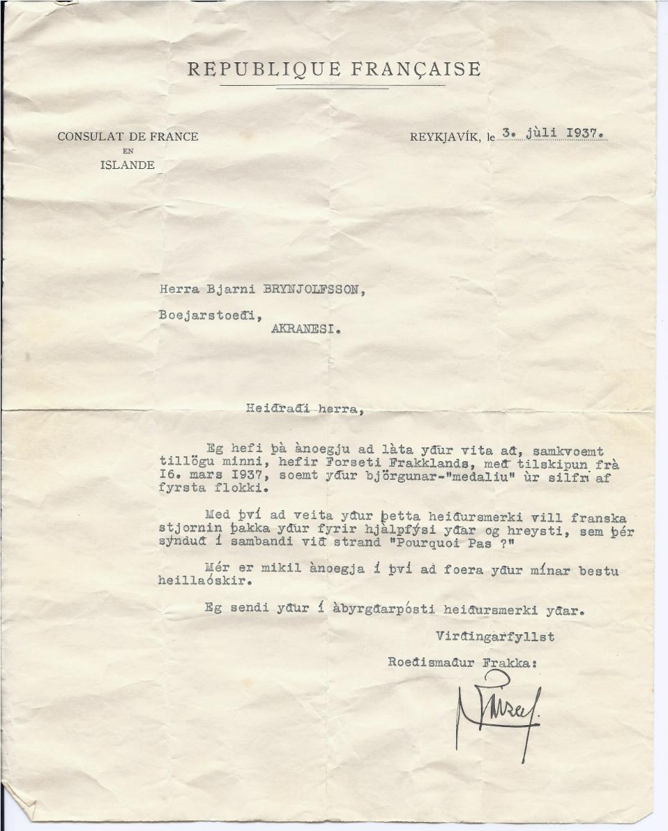 Heiðursmerki úr silfri sem forseti franska lýðveldisins veitti Bjarna Brynjólfssyni frá Bæjarstæði (Suðurgata 106) og hafnsögumanni á Akranesi vegna tilraunar til björgunar skipsáhafnarinnar á "Pourquoi Pas ?" þann 16.sept.1936. Peningurinn er 2,5 sm í þvermál með borða í frönsku fánalitunum, blár, hvítur, rauður og ankeri í miðju. Á bakhlið peningsins er grafið B. Brynjólfsson 1936. Meðfylgjandi eru 2 skjöl, annað frá ræðismanni frakka á Íslandi dagsett 3.júlí 1937 en þar segir: "Ég hef þá ánægju að láta yður vita að samkvæmt tillögu minni hefur forseti Frakklands (Albert Lebrun) með tilskipun frá 16.mars 1937 sæmt yður björgunar-medalíu úr silfri af fyrsta flokki. Með því að veita yður þetta heiðursmerki vill franska stjórnin þakka yður fyrir hjálpfýsi yðar og hreysti sem þér sýnduð í sambandi við strand Pourquoi Pas ?". Hitt skjalið er frá franska siglingarráðuneytinu en þar segir: "Siglinga-ráðuneytið vottar hér með að með tilskipun frá 16.mars 1937 hefur forseti franska lýðveldisins veitt hr. Bjarna Brynjólfssyni, hafnsögumanni 1.flokks björgunarmedalíu úr silfri, sem viðurkenningu áræðis hans og fórnfýsi til björgunar skipsáhafnarinnar á Pourquoi Pas ? sem brotnaði í spón á skerjum nálægt Borgarfirði á vesturströnd Íslands 16.sept.1936. Gef. Sigurður Guðjónsson, barnabarn Bjarna Brynjólfssonar.