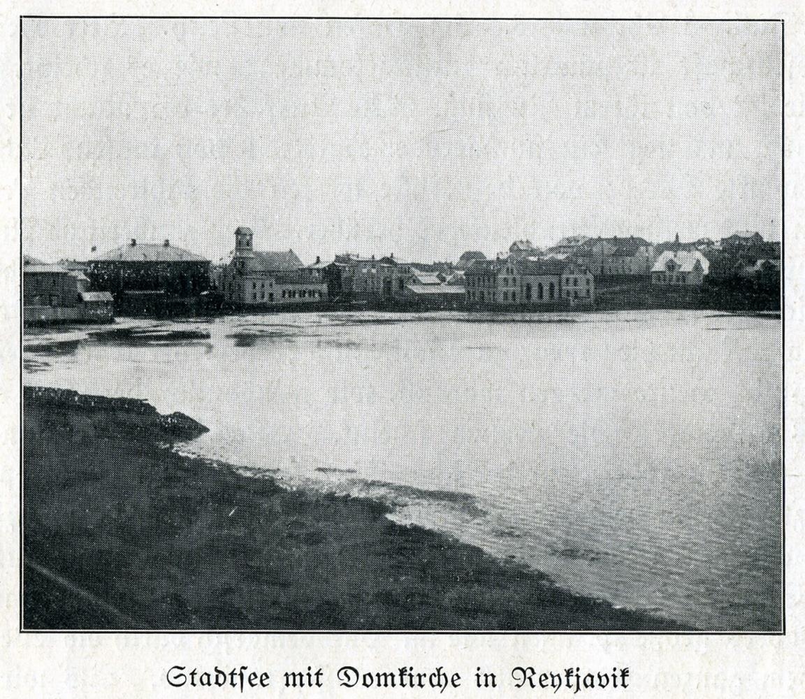 Reykjavíkurtjörn og miðbærinn með Dómkirkjunni f. miðju. Undir myndinn stendur: Stadtsee mit Domkirche in Reykjavík.