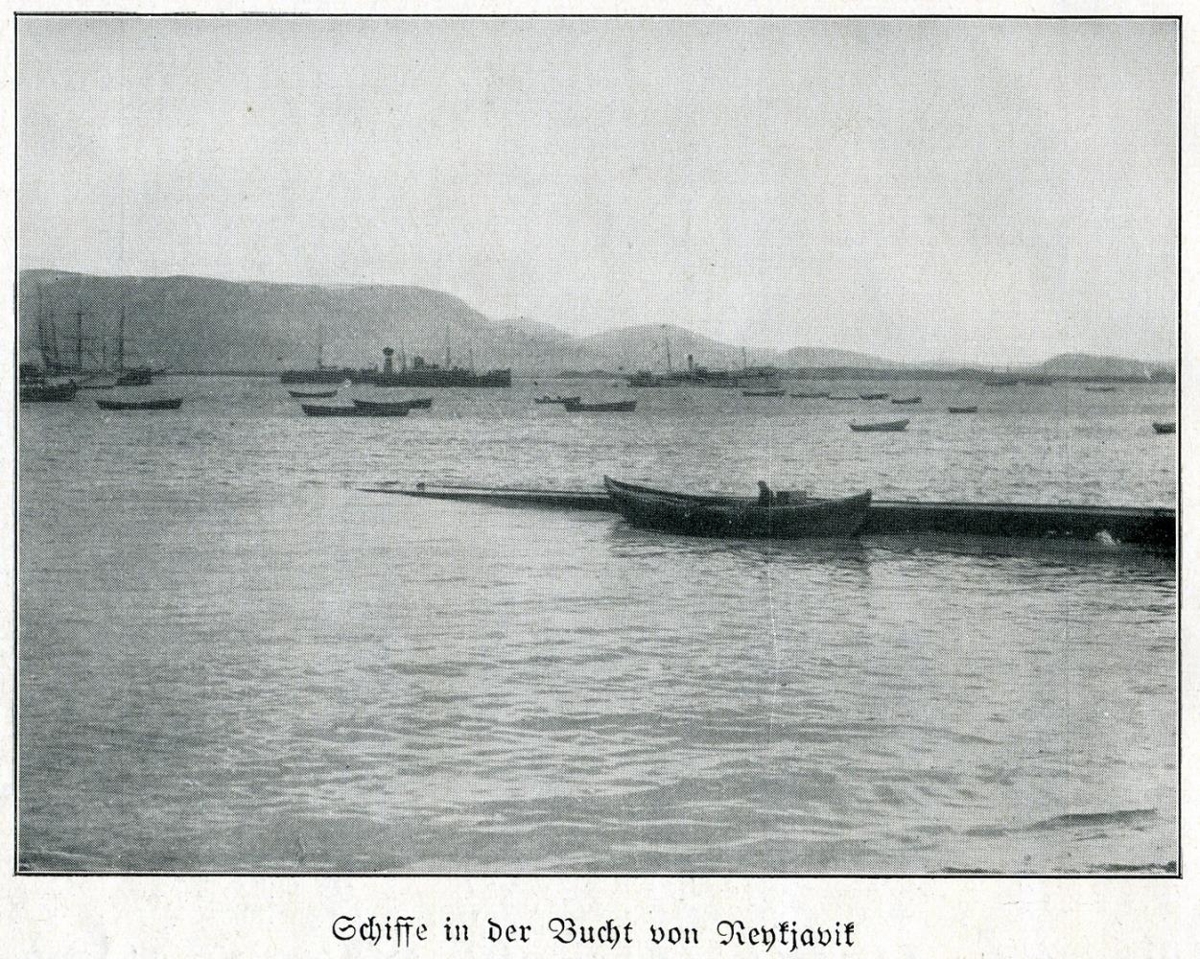 Reykjavíkurhöfn. Fremst liggur opin trilla við steinbryggju, fjær liggja fjöldi árabáta við stjóra og utar stærri skip, bæði gufuknúin og seglekip. Undir myndinn stendur: Schiffe in der Bucht von Reykjavík.