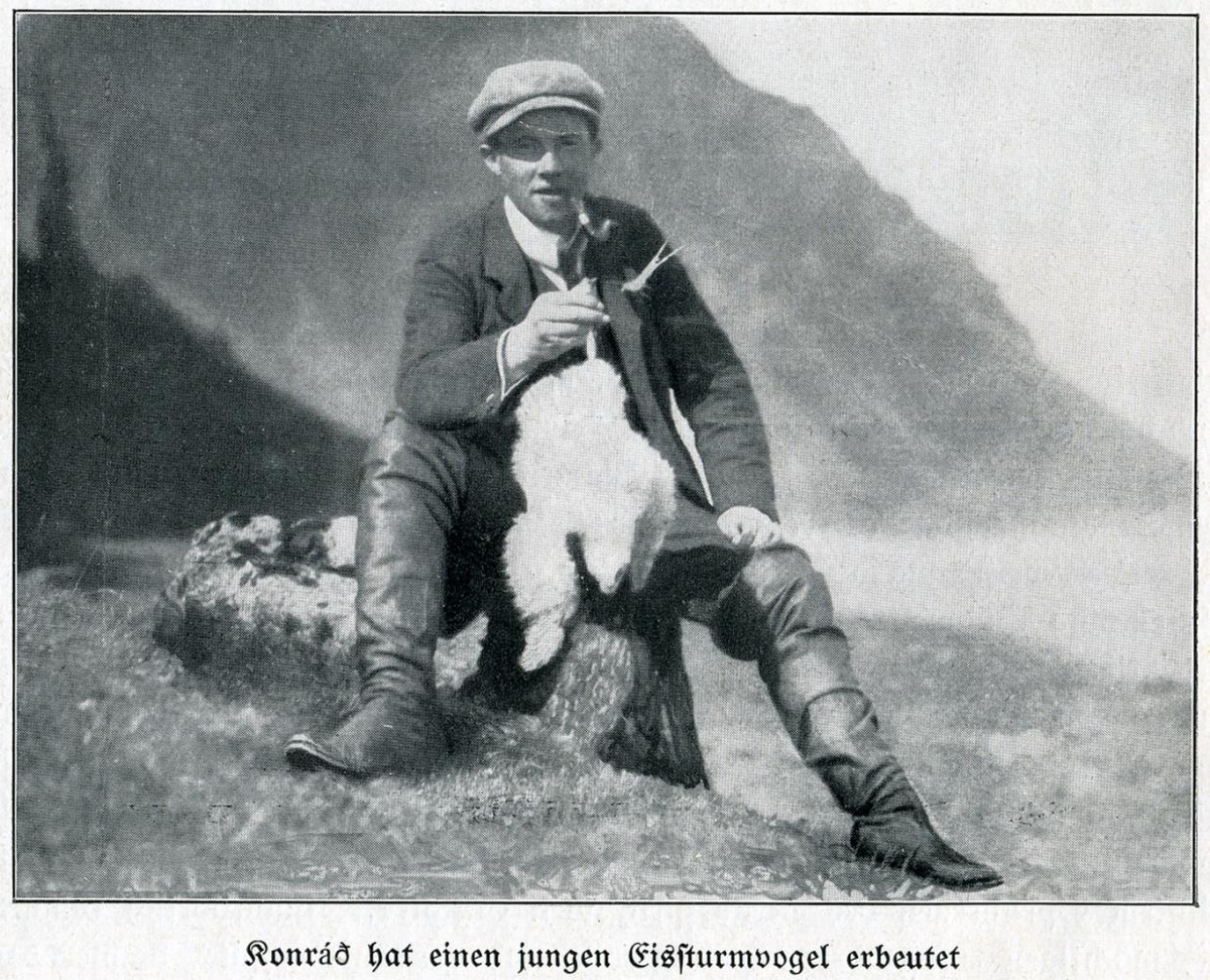 Karlmaður situr á steini og heldur á mávsunga. Undir myndinn stendur: Konráð hat einen jungen Fizztürmvogel erbeutet.