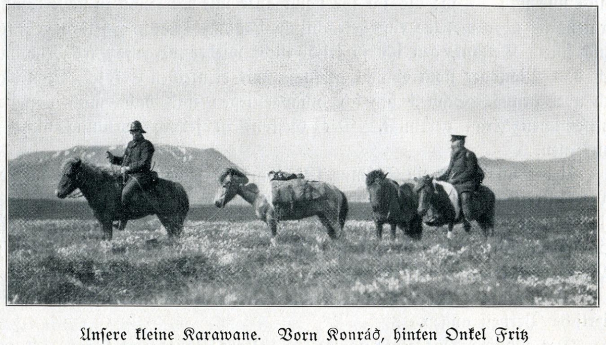 Tveir ferðamenn á hestum sínum ásamt trússhestum. Undir myndinn stendur: Unzere kleine Karawane. Forn Konráð, hinten Onkel Fritz.
