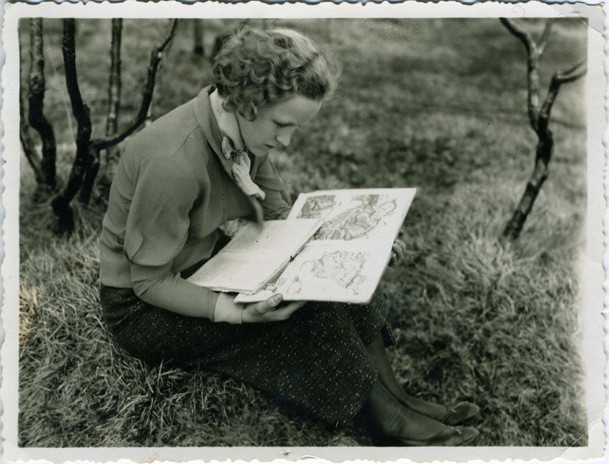 Ung kona situr á þúfu og skoðar teikningabók með aðra bók opna. Nokkur grönn birkitré í baksýn. Á bakhlið er skrifað: Til Egils / með kærri kveðju / frá Regínu Bjarnadóttur.