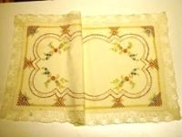með útsaumi. Utan með dúknum er drapplituð blúnda. Áslaug Magnúsdóttir