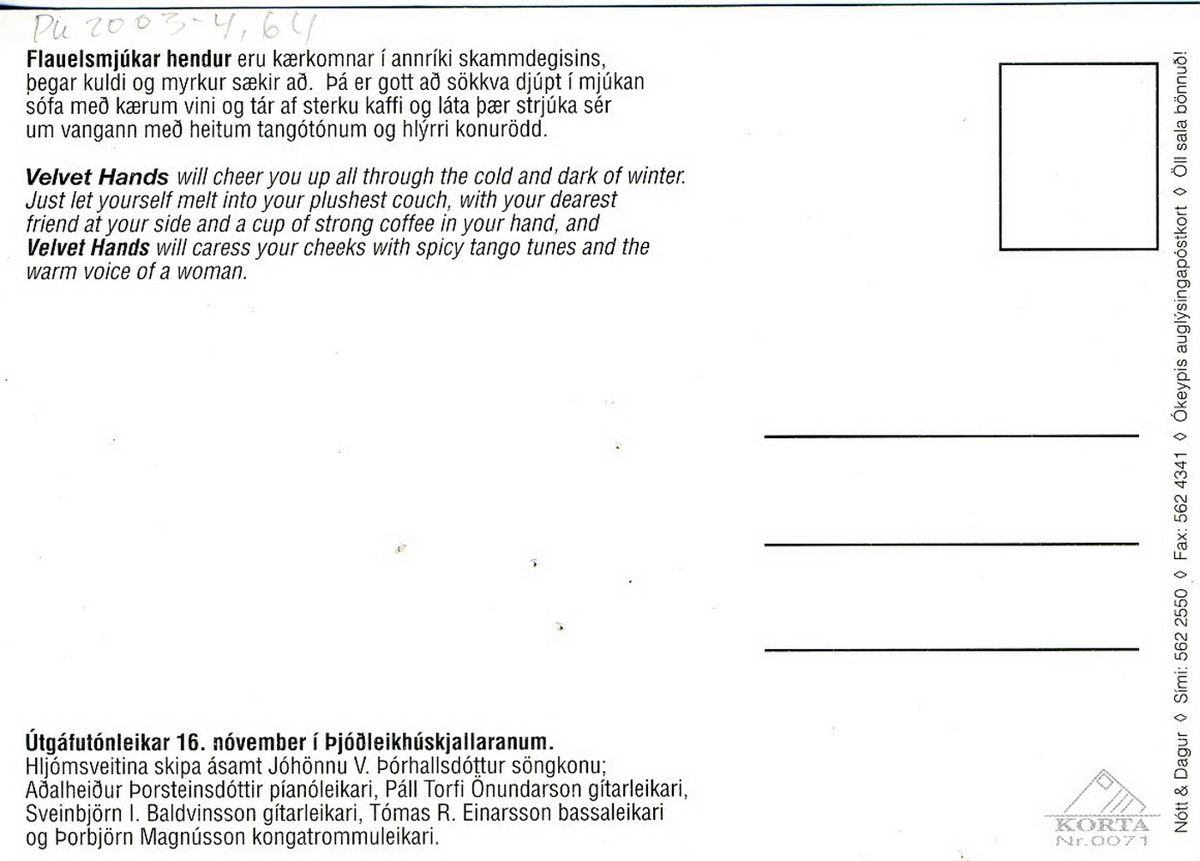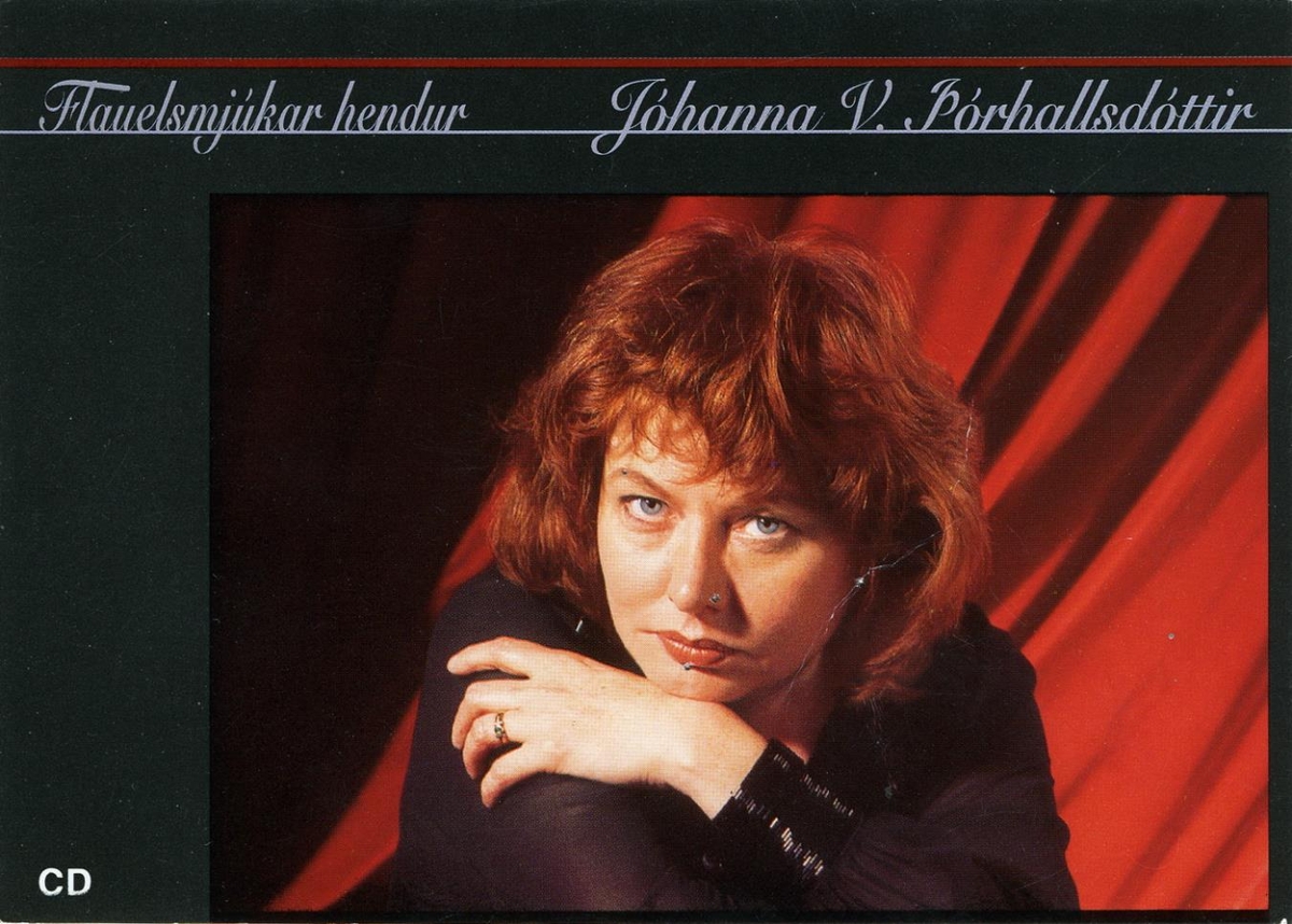 Andlitsmynd með rauðan bakgrunn. Texti: Flauelsmjúkar hendur / Jóhanna V. Þórhallsdóttir. Á bakhlið m.a.: Flauelsmjúkar hendur eru kærkomnar í annríki skammdegisins .../ Útgáfutónleikar 16. nófember í Þjóðleikhúskjallaranum. / Nótt & Dagur / KORTA Nr. 0071.
