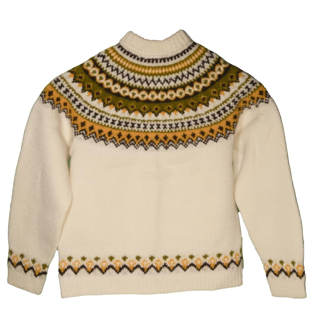 Peysa, handprjónuð hvít með breiðu mynstri að ofan, mjórra framan á ermum og neðan í gulum, grænum og brúnum lit. Peysan er hneft að framan með silfurhnöppum. Peysan er gjöf til Margrétar Þorleifsdóttir frá Elísabetu Linnet sem var gift Svavari Ólafssyni. Svavar var fóstursonur Svövu Þorleifsdóttur kennara og skólastjóra. Peysan er prjónuð af Svövu 1965. Afhent safninu 25.03.1996 gefandi ókunnur.