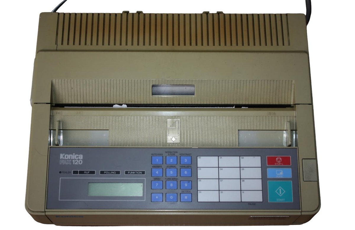 Faxtæki af gerðinni KONICA fax 120. Kemur úr eigu Dýrfinnu Torfadóttur, gullsmiðs.