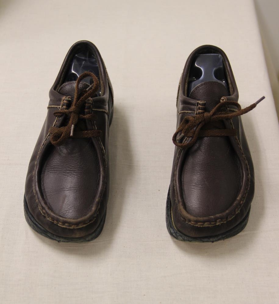 Skórnir eru brúnir að lit með brúnum reimum. Þetta eru handsaumaðar mokkasíur, hannaðar af Kristni Bergssyni, handsaumaðar af honum og handstungið gat fyrir nálina. Stærð: 37.