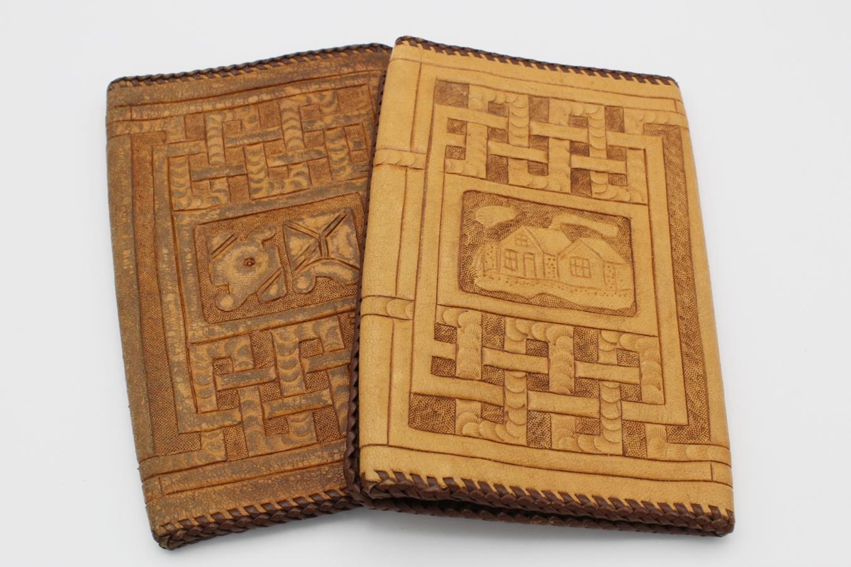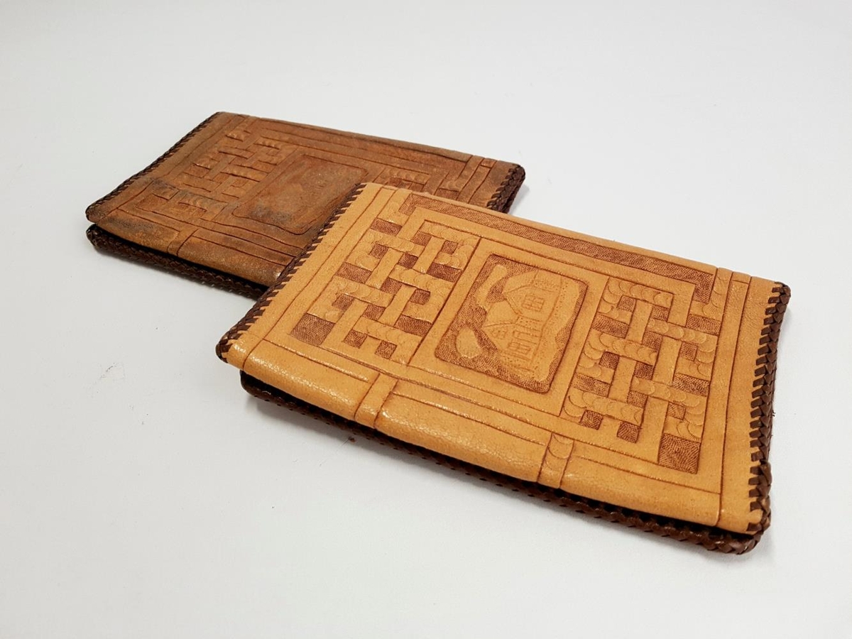 Tvö handgerð seðlaveski úr leðri saumuð með dökkri leðurreim. Þrír vasar eru að innanverðu, veskin eru alskreytt að utan með torbæjarmynd að framan en með ólíkum táknum að aftan til að aðgreina þau. Veski a) var í eigu Jóns Guðjónssonar og veski b) sem er sjáanlega meira notað var í eigu Sigurðar bróður hans.
