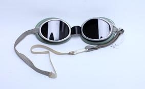 Snjógleraugu með dökku gleri, málmumgjörð og grængráu gúmmíi umhverfis málmin. Hvít léleg teygja með hvítri plastsmellu til festingar.