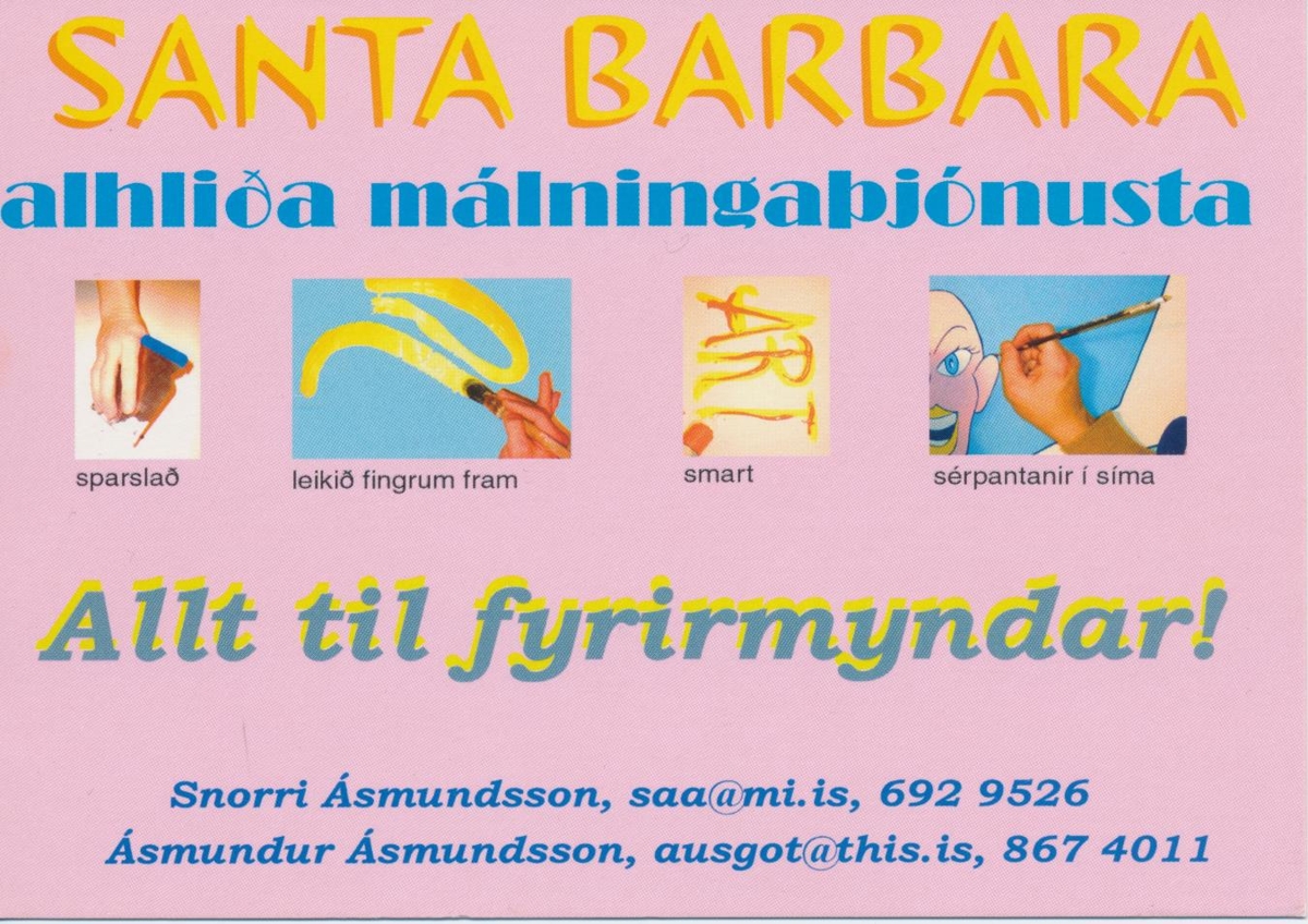 Á blaði stendur: SANTA BARBARA, alhliða málningarþjónusta, allt til fyrirmyndar og svo nöfn og netföng og símanúmar listamanna. Skýringamyndir með texta eru á blaðinu, til dæmis sýnt þegar verið er að sparsla og texti undir.