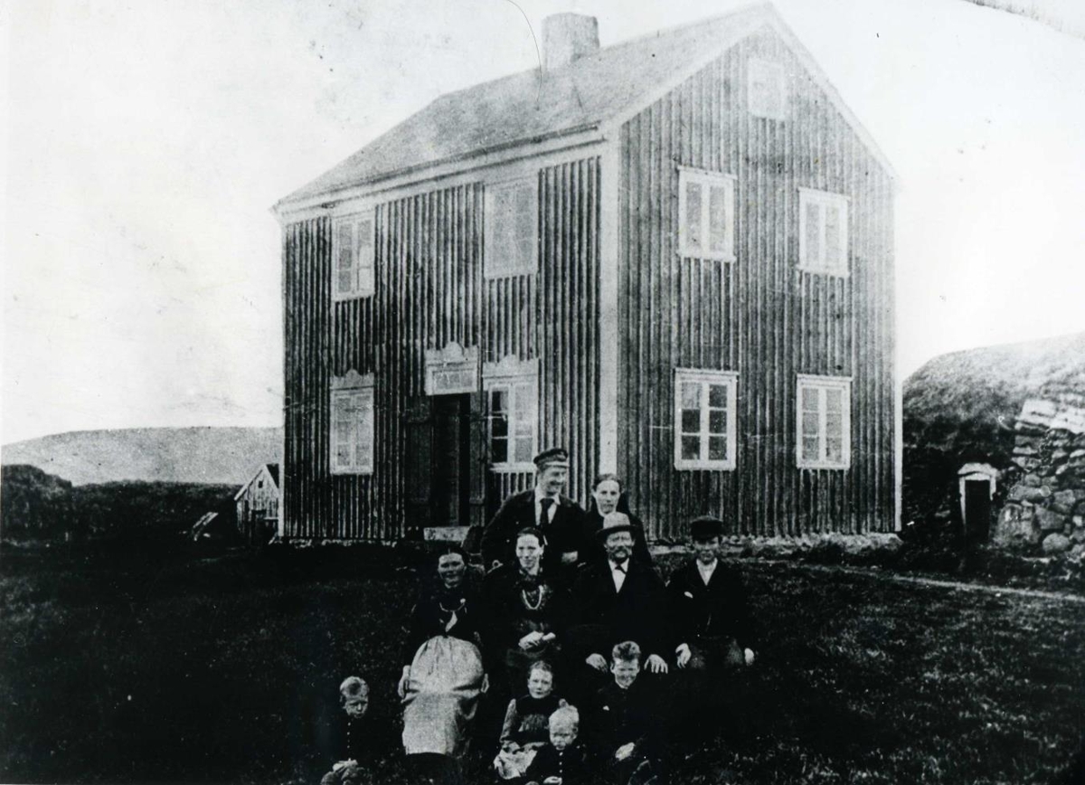 Íbúðarhúsið í Öxney á Breiðafirði var reist í kringum 1880 og voru viðirnir í það fluttir tilsniðnir frá Noregi líkt og í Norska húsið. Á myndinni má sjá danskan mann sem kallaður var Gardi og stúlkuna Estívu. Konan með hvítu svuntuna er Sigríður Jóhannsdóttir frá Ökrum sem gift var Eiríki Kúld (aths. ekki séra E.K.). Þá eru hjónin Sigurlaug Jóhannsdóttir og Jóhann Jónasson bóndi í Öxney en þau voru ábúendur árin 1900 - 1912. Hrokkinhærði drengurinn er Jónas Jóhannsson sem síðar varð bóndi í Öxney. Hann bjó frá 1913 til 1967 þegar Öxney fór í eyði.