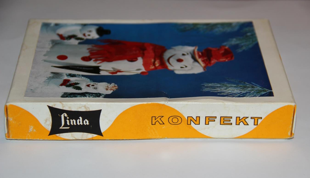 1. Kassi með snjókarlamynd. Texti: Linda konfekt.