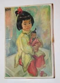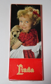 2. Kassi, rauður að lit, með mynd af lítilli stúlku með hund. Texti: Linda konfekt.