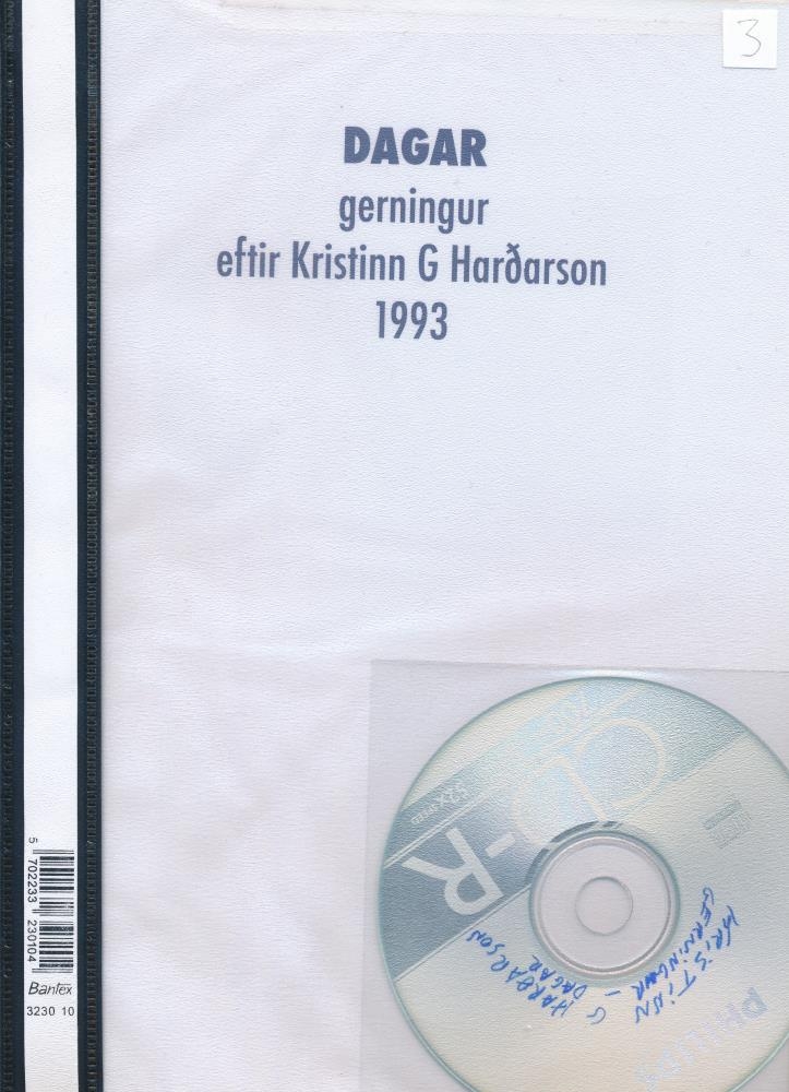 Lýsing: Innihald möppu: CD diskur sem á stendur: Kristinn G. Harðarson, gerningur-dagar. Síðan kemur texti um Gjörninginn, DAGAR gerningur eftir Kristinn G. Harðarson 1993. Gjörningurinn var fluttur 1993 í Nýlistasafninu, flytjendur voru: Ásmundur Ásmundsson, Haraldur Karlsson, Hlynur Hallson, Margrét Blöndal.
