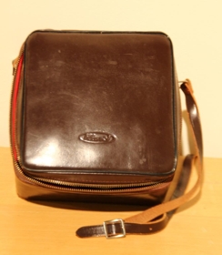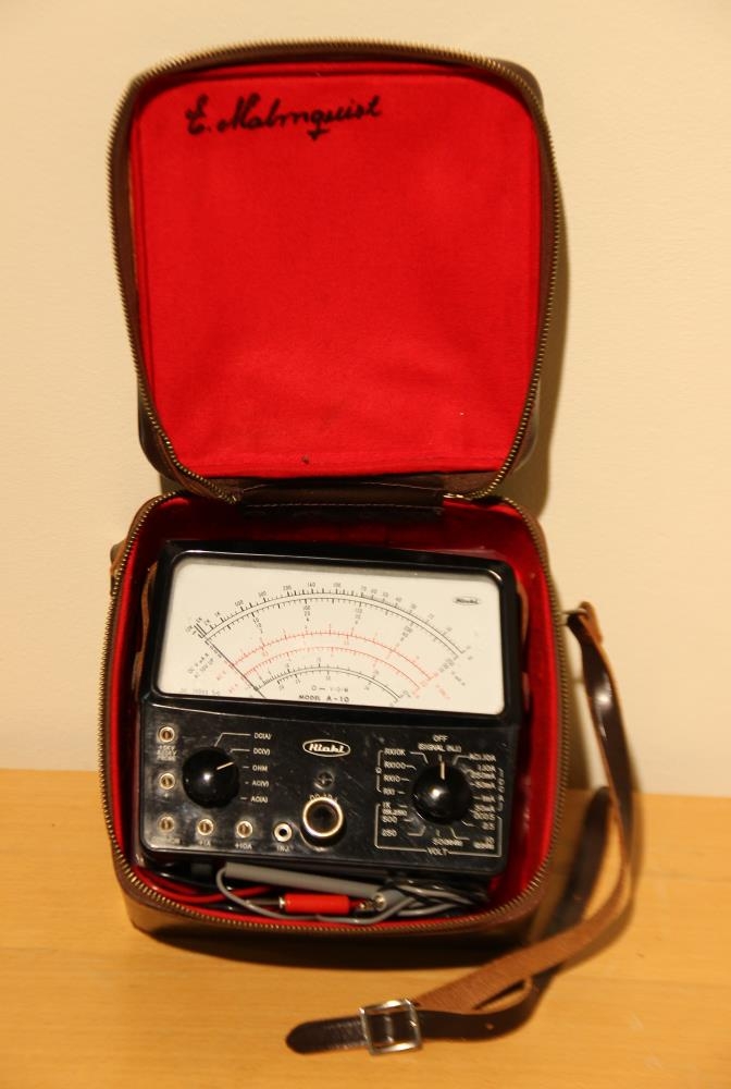 Mælirinn er af gerðinni Hioki, módel A-10. Hann er svartur með svörtu leðurhaldi, í rauðbrúnni leðurtösku með rauðu fóðri og rennilás. Þetta er AVO mælir, hann mælir Amper, Volt og Ohm(viðnám).