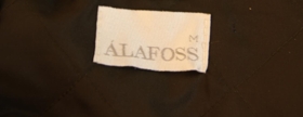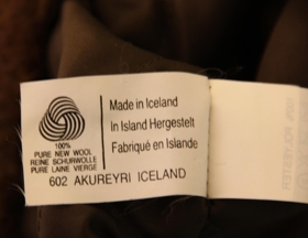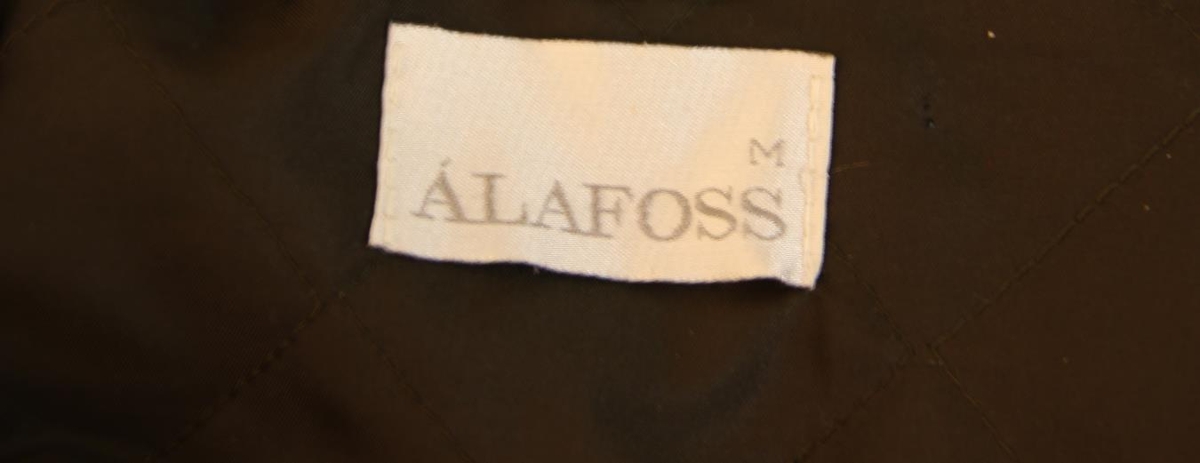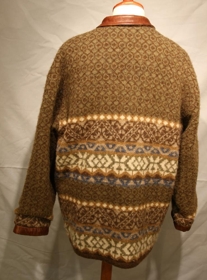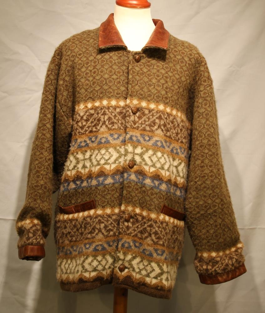 Ullarkápan er mógræn með mislitu munstri. Hún er með skinnbryddingum á vösum, hálskraga og ermum. Stærð: Medium.