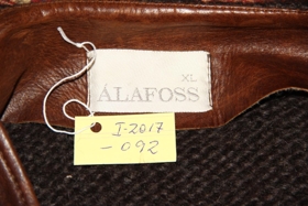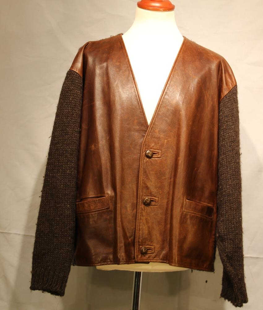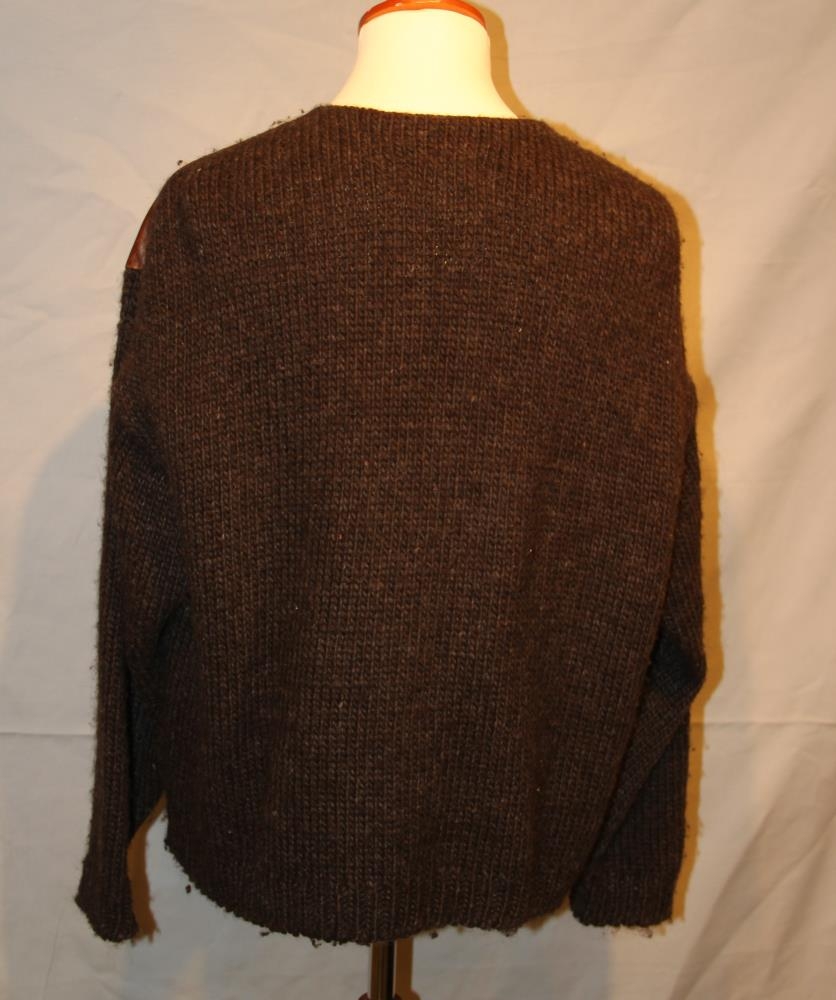 Peysan er svört og prjónuð en framstykkið er úr brúnu leðri. Stærð: Extra large.