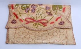Ljóst kvenveski. EInföld að sniði, eitt hólf og lokið leggst yfir helming framhliðar, engar festingar, smellur eða höld. Veskið er með fjólubláu munstri, þráður saumaður í veskið á köntum og bak- og framhlið. Munstrið á lokinu er skrautlegra, fjólublá blóm og bleik slaufa, græn lauf. Fjólublái þráðurinn er líka saumaður í lokið en litirnir í blómum og slaufum er málað. Taskan er úr einhverskonar plast-leðurlíki.
