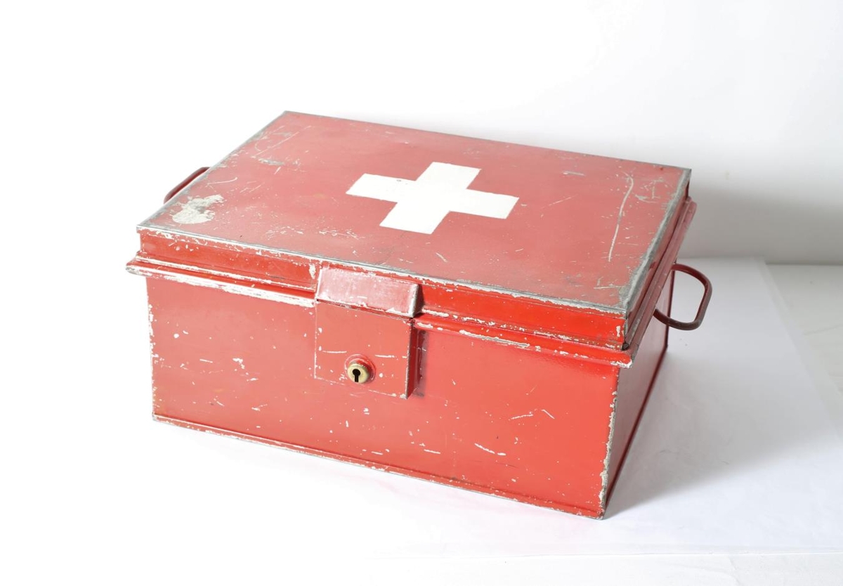 Stór rauður sjúkrakassi úr járni með stórann hvítann kross á loki. Kemur frá Egilsstaðaskóla en þangað kom hann þegar Alþýðuskólinn var lagður niður. Þórhallur Árnason húsvörður kom með hann til safnsins.