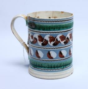 Hvít stór postulínskanna. Stór drykkjarkanna með hvítu handfangi, grófu munstri, grænt, blátt, brúnt. Kannan er sprungin og spengd í bak og fyrir. Áberandi viðgerðir og áhugavert að sjá hvernig kannan hefur verið bætt og löguð.