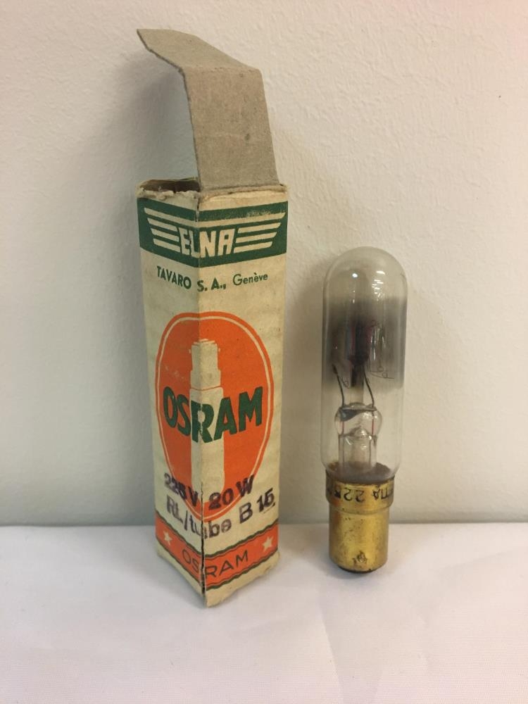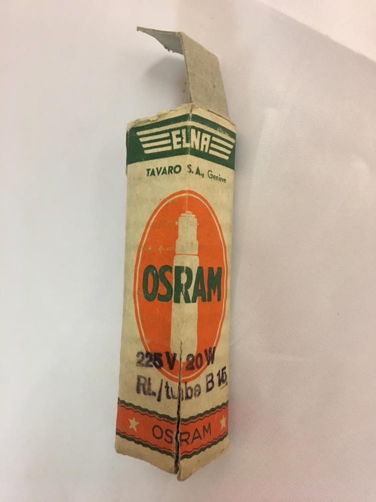 Ljósapera í kassa. Notuð ljósapera í pakkningu merkt „OSRAM“ sem er þekkt ljóshönnunar fyrirtæki sem sérhæfir sig í gerð ljósapera. Fyritækið OSRAM var stofnað í Munich í Þýskalandi árið 1919 (Wikipedia. OSRAM. 2018).