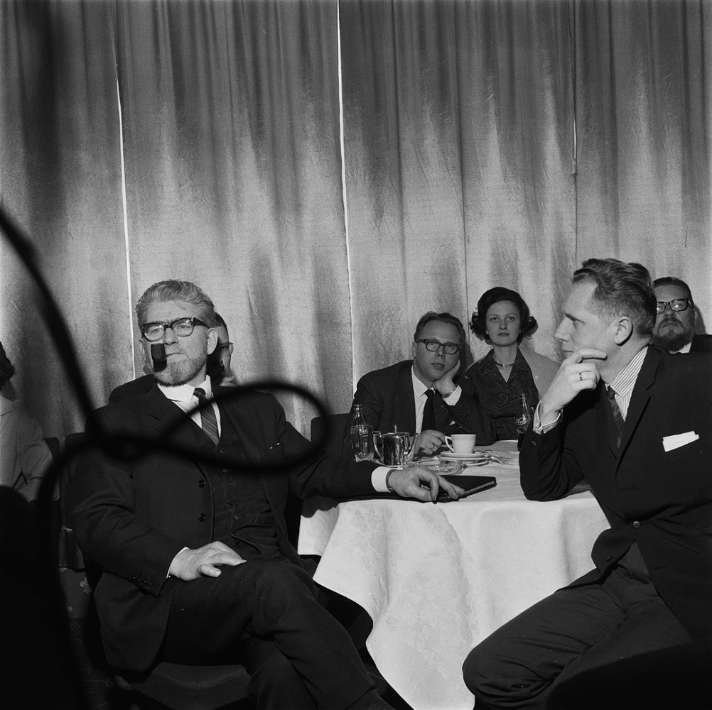 Fimm karlmenn og ein kona sitja við borð. Einn maðurinn er með pípu. Kaffikanna, bolli og öskubakki á borðinu.