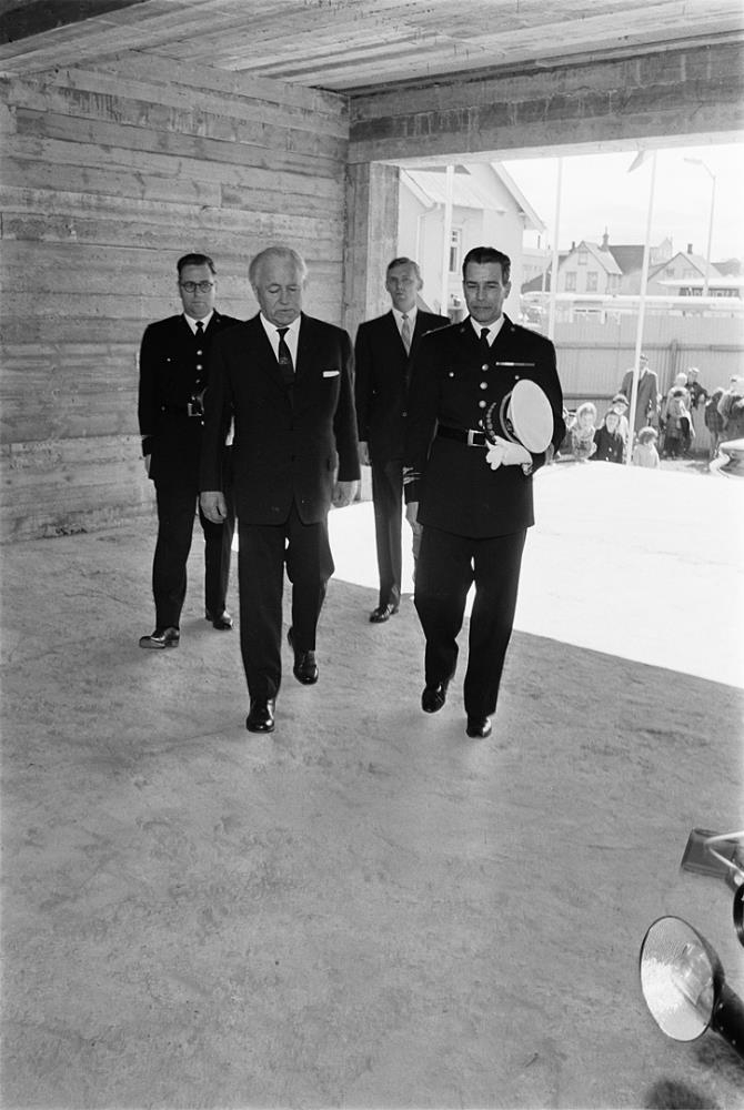 Karlmaður, forseti Íslands, gengur inn í nýju lögreglustöðina, sem er í byggingu, ásamt þremur karlmönnum, tveir þeirra eru í lögreglubúningum. Fólk og krakkar eru fyrir utan og fylgjast með.