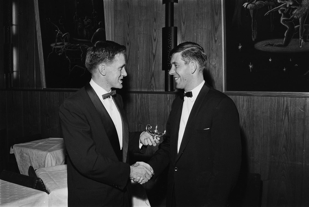 Gunnar Eyjólfsson leikari hlaut silfurlampann fyrir leik sinn í Pétri Gaut. Bessi Bjarnason leikari óskar Gunnar til hamingju. (ILB 2018)