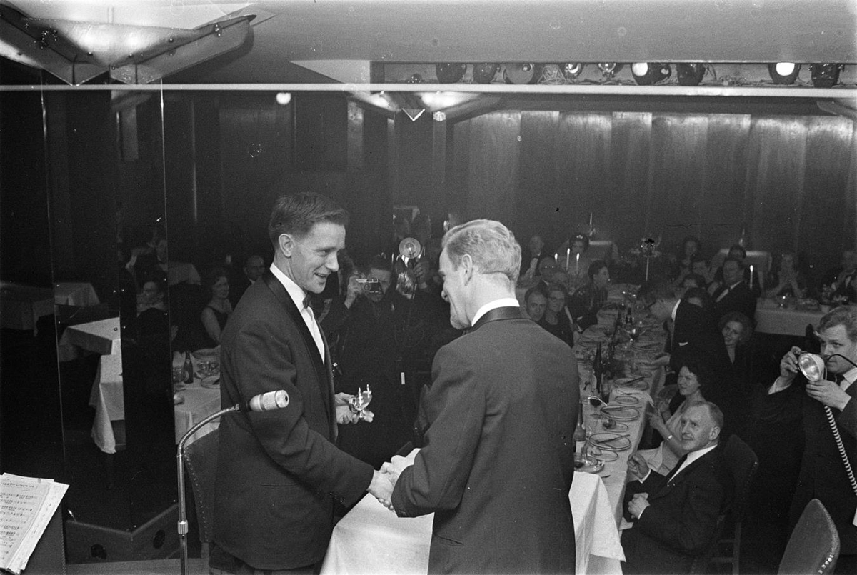 Gunnar Eyjólfsson leikari hlaut silfurlampann fyrir leik sinn í Pétri Gaut. Hér tekur hann við gripnum af Sigurði A. Magnússyni og þeir takast í hendur.
