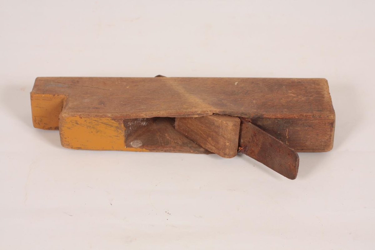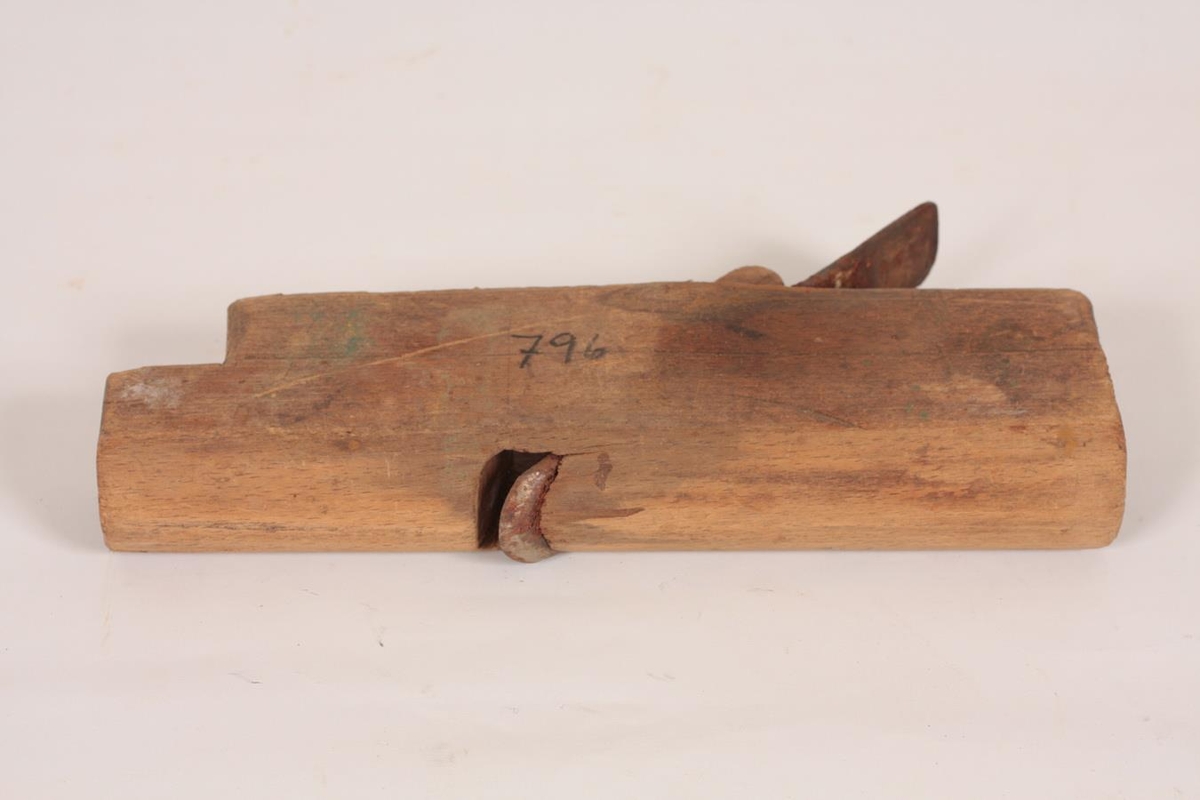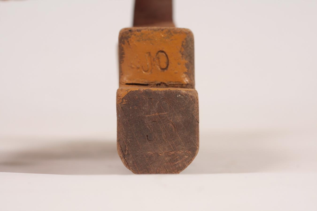 Skrúbbhefilstokkur úr brenni, merktur eiganda með J.O. á enda.