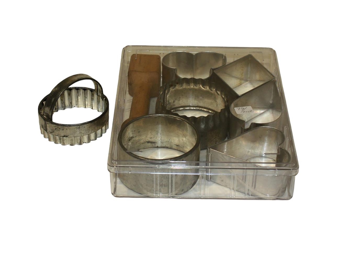 Smákökuform ýmiskonar og einnig form til að móta út deig úr hakkavél. Rjóma- og glassúrsprauta