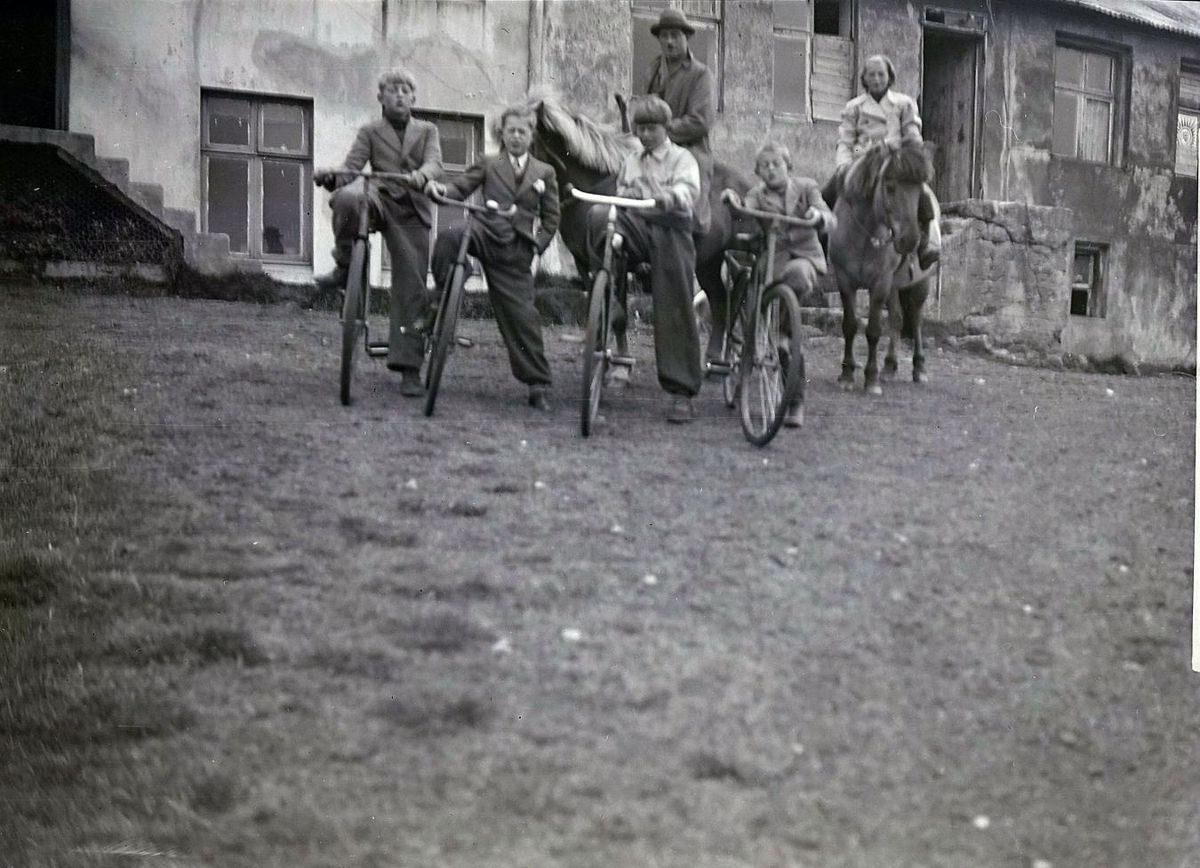 Á hlaðinu í Hólmi í Landbroti um 1940. Valdimar Runólfsson og Rannveih Helgadóttir á hestbaki. Synir þeirra Helgi og Runólfur á reiðhjólum líkt og tveir aðrir óþekktir drengir.
