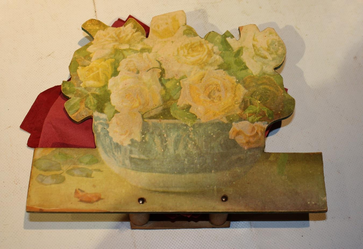 Servíettustatíf úr krossvið með álímdum myndum með blómum og Servíettur. Kemur úr dánarbúi Valgerðar og Þórodds á Bekansstöðum