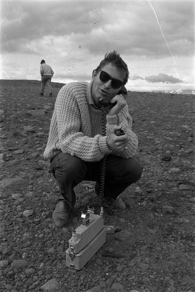 Tekið úti. Karlmaður krýpur í auðninni og talar í talstöð. Hann heldur á pípu. Annar maður gengur í burtu.