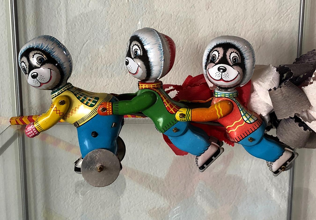 Leikfang úr blikki og hefur verið upptrekt en nú bilað. Þrír sam-hangandi bangsar á skautum. Kemur úr dánarbúi Valgerðar og Þórodds á Bekansstöðum