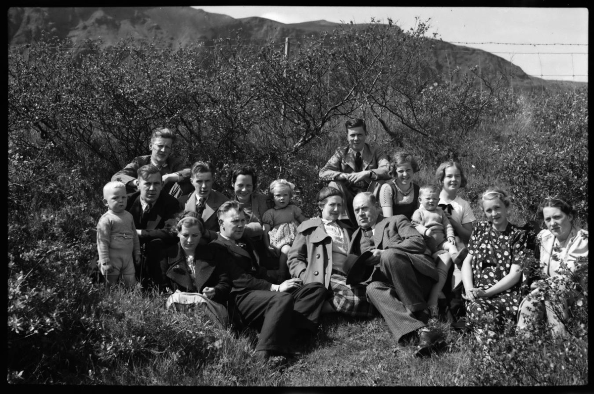 Fjölskylda í lautarferð. Jón og Jakobína sitja fyrir miðri mynd í kringum þau sitja börn, tengdabörn og barnabörn.